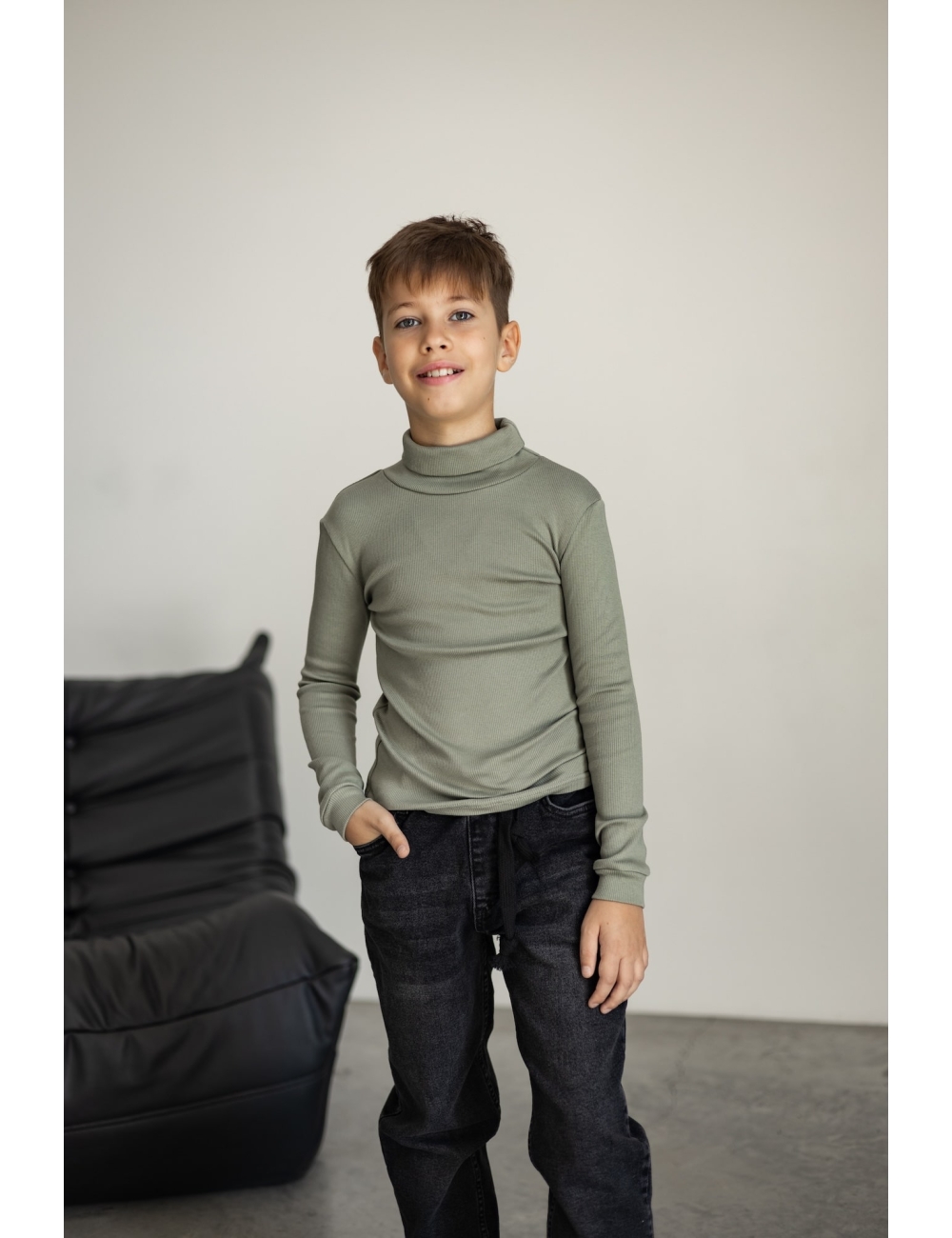 Гольф для хлопчика з м’якої трикотажної тканини в рубчик з легким начісом, що забезпечує тепло, комфорт і свободу рухів, ідеально підходить для прохолодної погоди та повсякденного носіння.