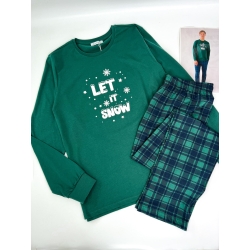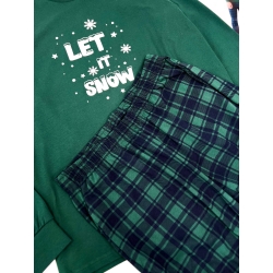 Удобный комплект из 100% хлопка: зеленый лонгслив с ярким принтом "Let It Snow" и брюки в клетку с эластичным поясом. Идеальное сочетание комфорта и праздничного настроения.