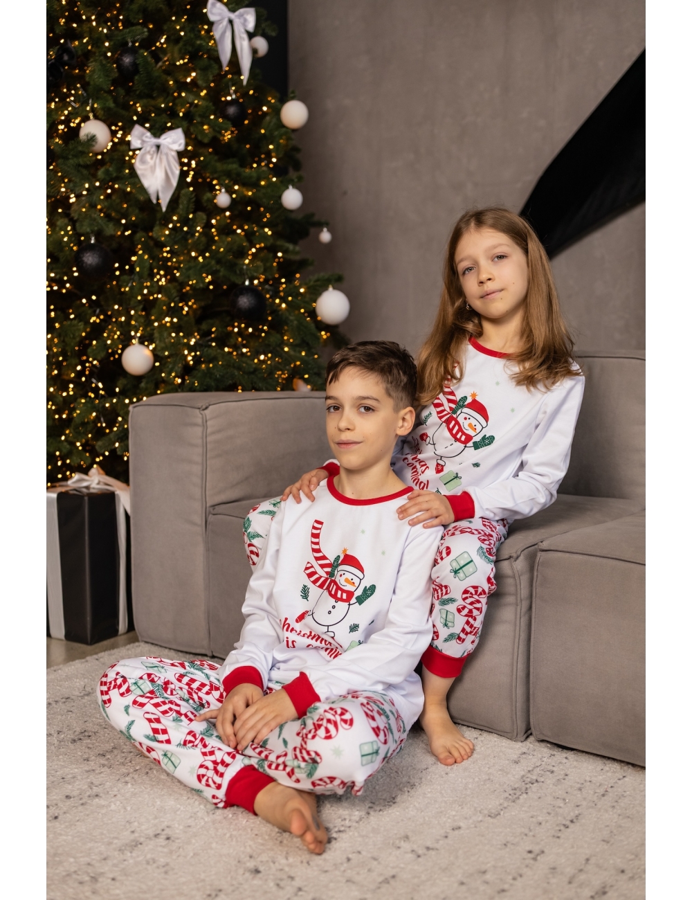 Детская пижама из 100% хлопка с начёсом: белоснежная кофта с принтом снеговика и штаны с весёлым новогодним узором. Идеально для зимних вечеров, праздничных фотосессий и подарка под ёлку. Лёгкая, тёплая и комфортная для мальчиков и девочек!