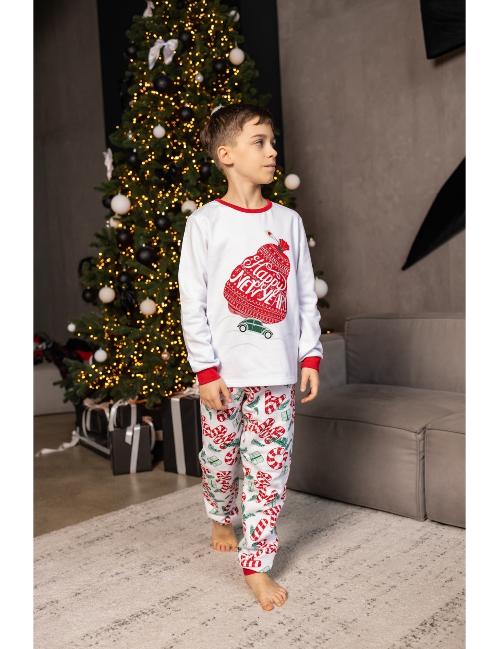 Детская пижама из 100% хлопка с начёсом: белая кофта с принтом машины, везущей подарок, и штаны с новогодним узором. Идеально для зимних вечеров, праздничных фотосессий и в качестве подарка под ёлку. Тёплая, комфортная и стильная для мальчиков и девочек!